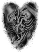 Il cuore, situato al centro della scena, è il punto focale del disegno. Tuttavia, ciò che lo rende particolarmente affascinante è il suo stato diviso in due parti. La linea di divisione scolpisce in modo netto il cuore, come se fosse stato tagliato con precisione. Da una parte del cuore, emerge un teschio misterioso, con le sue orbite vuote e il sorriso sinistro che suggeriscono un'essenza oscura e segreta.