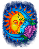 La luna è rappresentata con il suo caratteristico profilo, circondata da stelle scintillanti che illuminano il cielo notturno. Il sole, invece, ha linee solari che si irradiano verso l'esterno, simboleggiando la sua forza e vitalità.